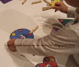Como Garbancito ya tiene más que superada la lección de los colores, preferí prescindir de ese detalle y solamente escribí un número en cada pinza.